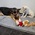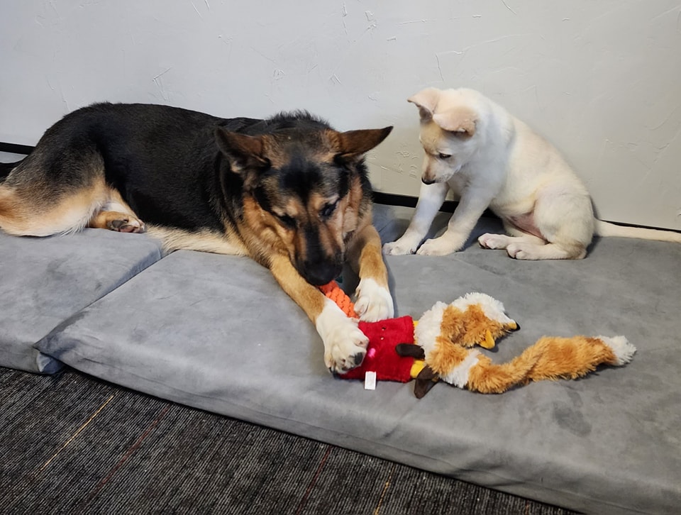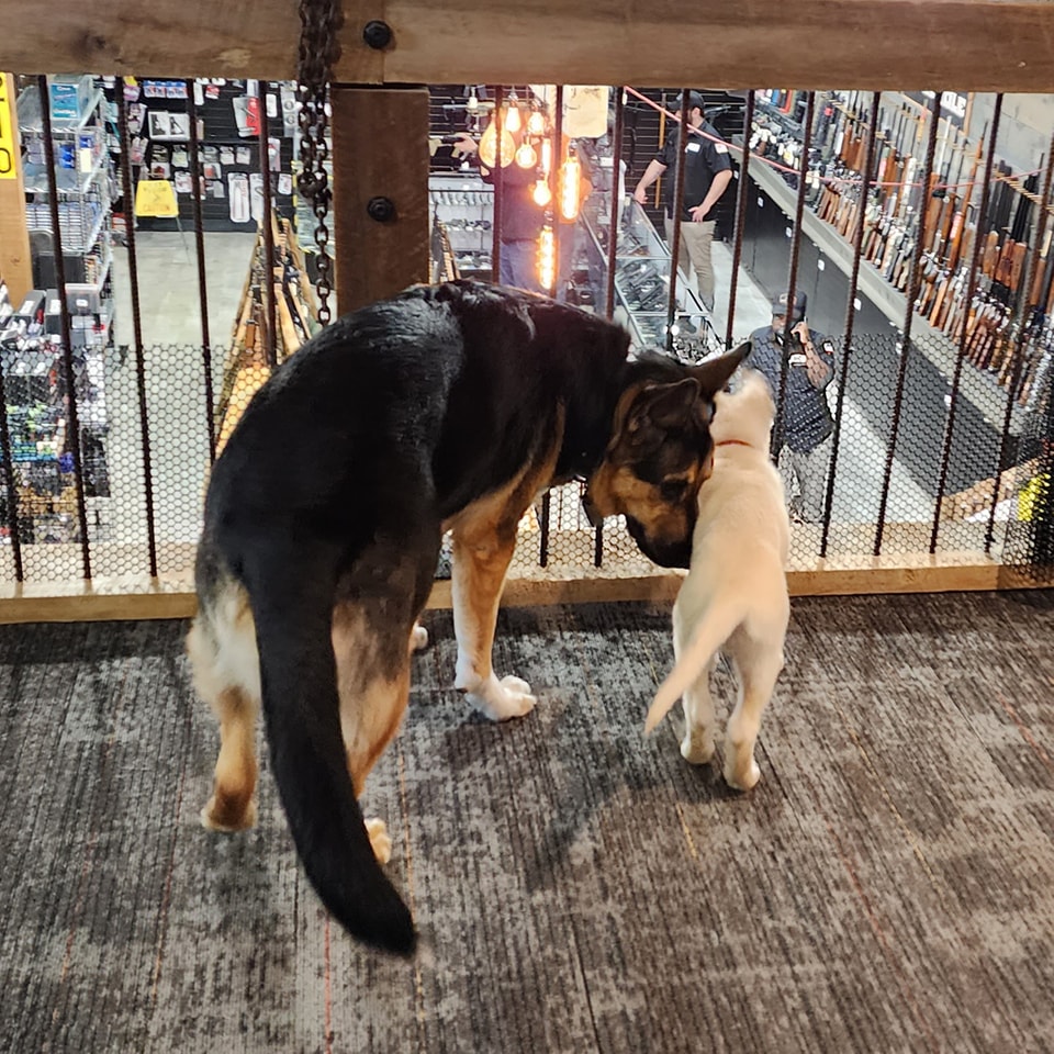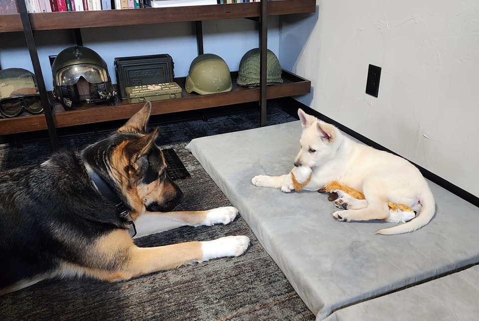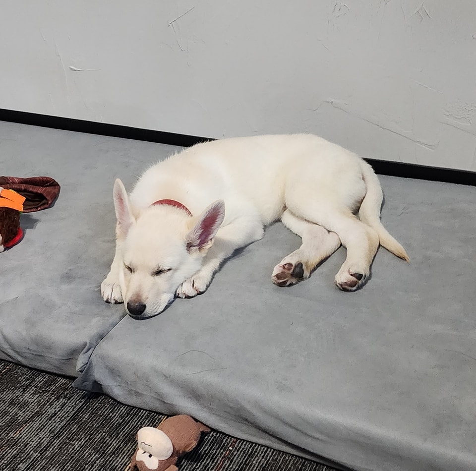 Welcome the newest shop dog…Astra! She is an 8 week old white german shepherd from Echo Dogs White Shepherds. Today is her first day of work, and she has been busy getting training from Panzer…which apparently includes napping
