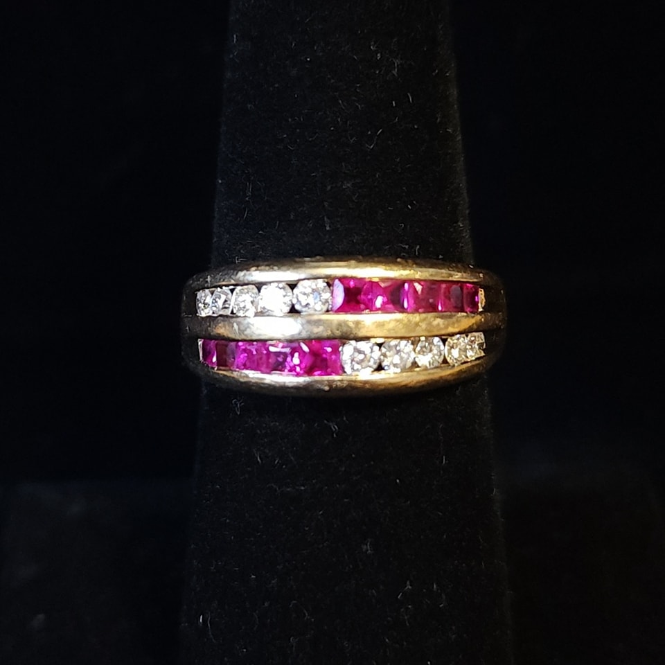 We strive to provide a selection of unique jewelry. This piece fits that bill! Set in 14Kt yellow gold, this 2 row band has .30Ct total weight of round diamonds and .37Ct total weight of princess cut rubies. What I love about this ring is how rows are offset and the mixture of round and princess stones! It certainly gives this ring flair!