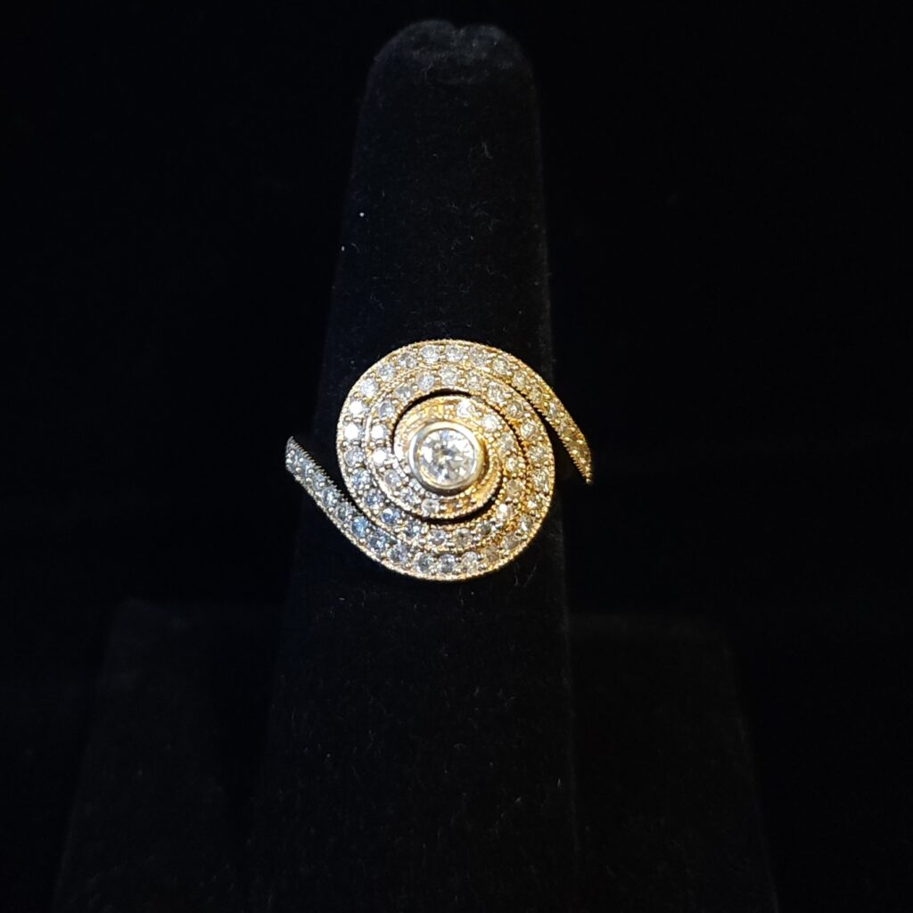 Set in 14Kt yellow gold, this ring has 2 twists of diamonds that surround a center diamond, for .77Ct total weight of diamonds. This ring is stunning and really does make a statement, especially set in yellow gold!