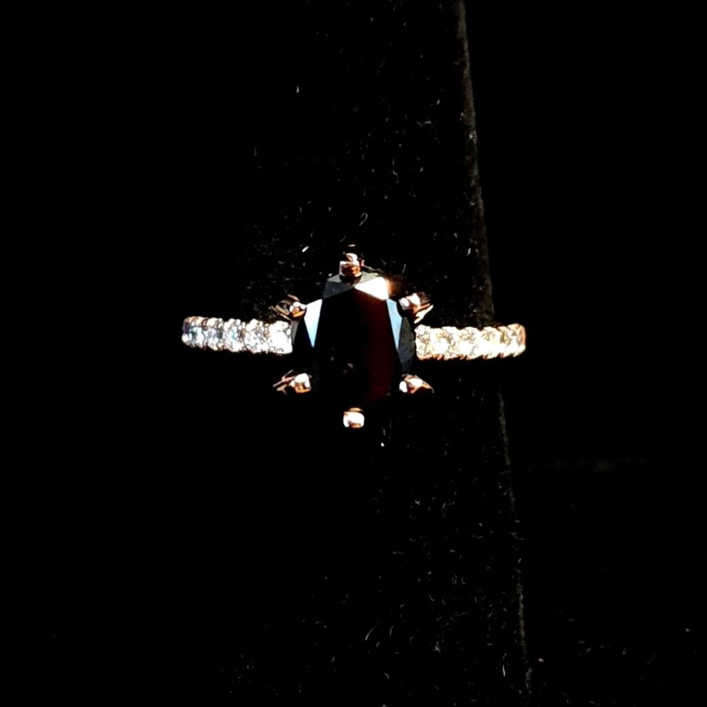 Set in 14Kt rose gold, this ring has a magnificent 2.0Ct oval black diamond at its center. This gorgeous black diamond is accented by a 1/3Ct total weight of white diamonds! The combination makes for a beautiful ring!