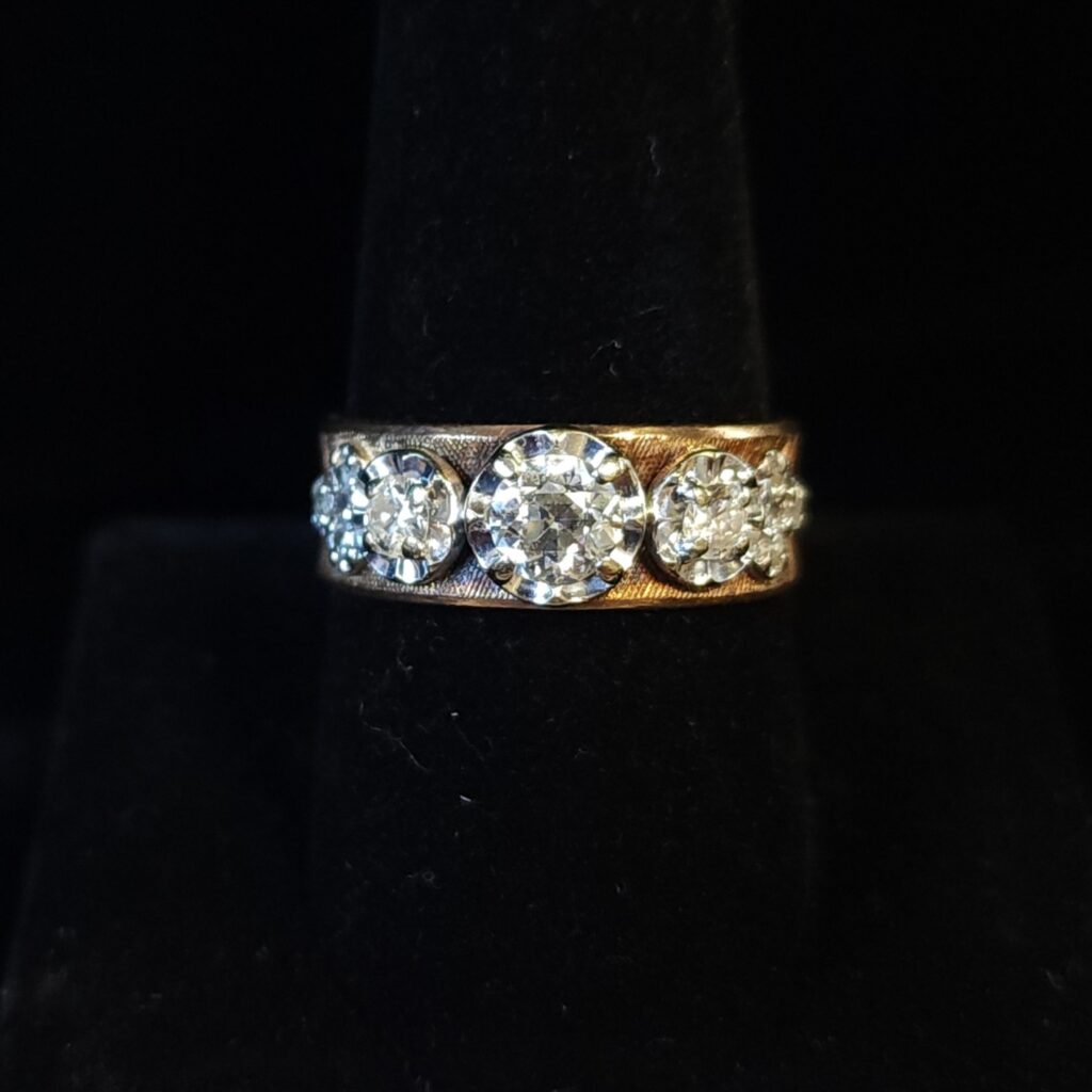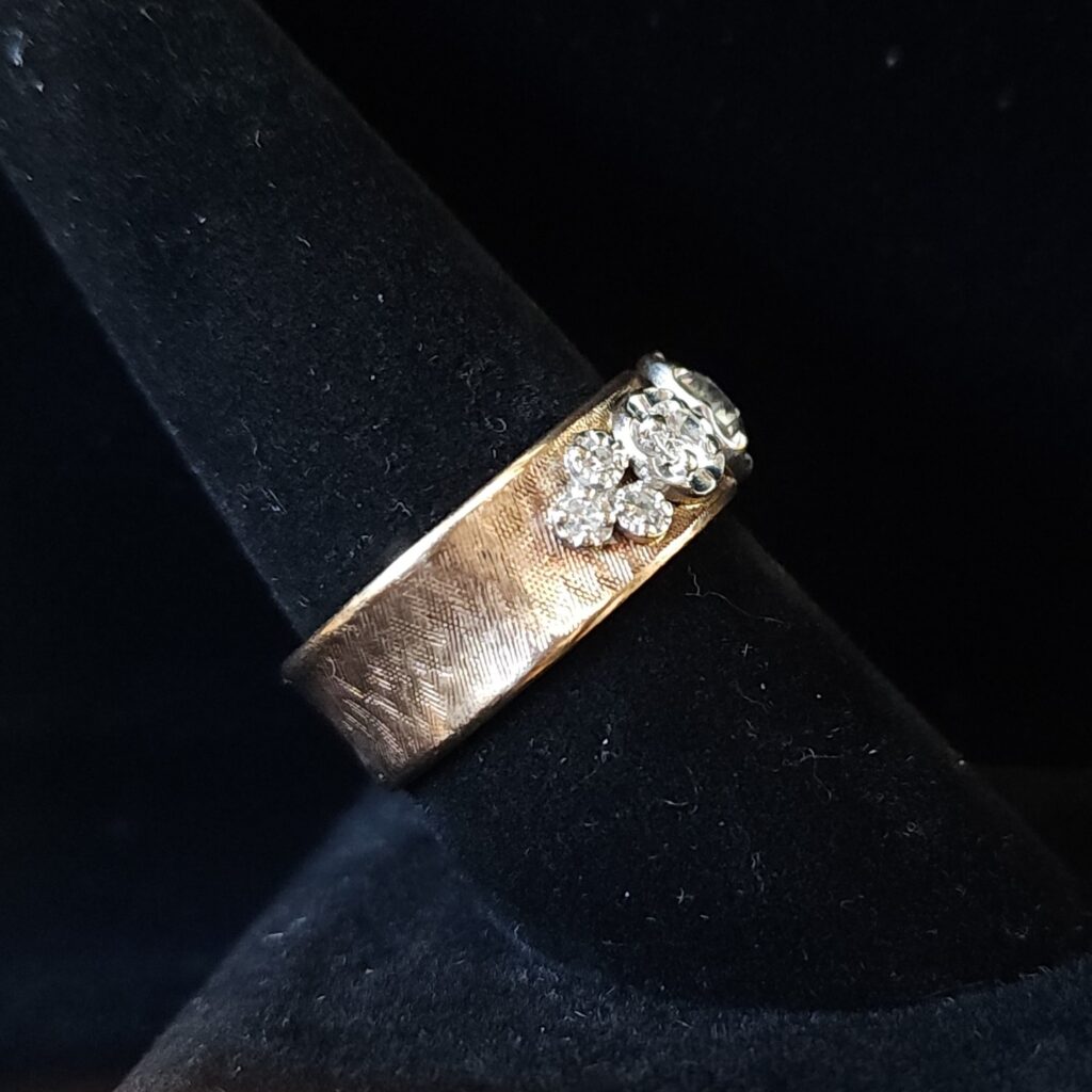 This is one of the more unusual antique rings we have seen in a bit. The ring itself is 10Kt yellow gold, and the diamonds are illusion set in white gold. The ring shank also has a distressed-look finish applied to it. All those things combined equals a very beautiful…and interesting…antique ring! #morethanakiss #antiquejewelry