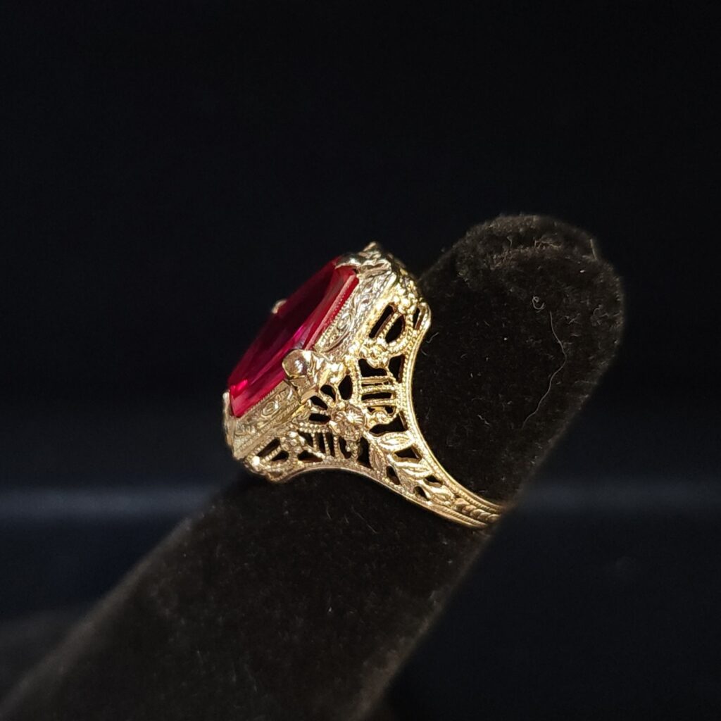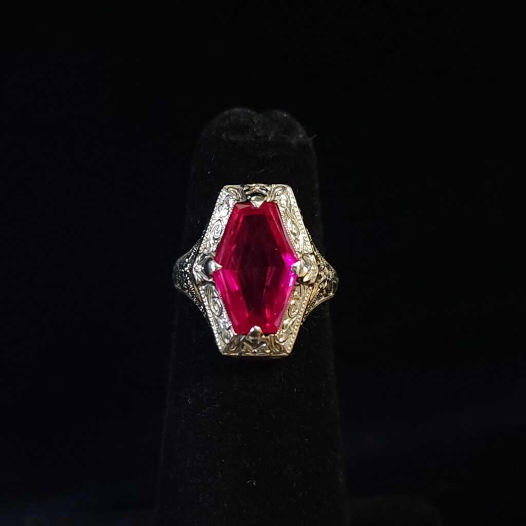 Set in 14Kt white gold, this beautiful antique filigree ring has a gorgeous coffin cut ruby as its star. This is a uniquely cut antique ruby in an equally uniquely detailed ring. If this ring could talk, I wonder what stories it would tell ???? ❤️ #morethanakiss #antiquejewelry