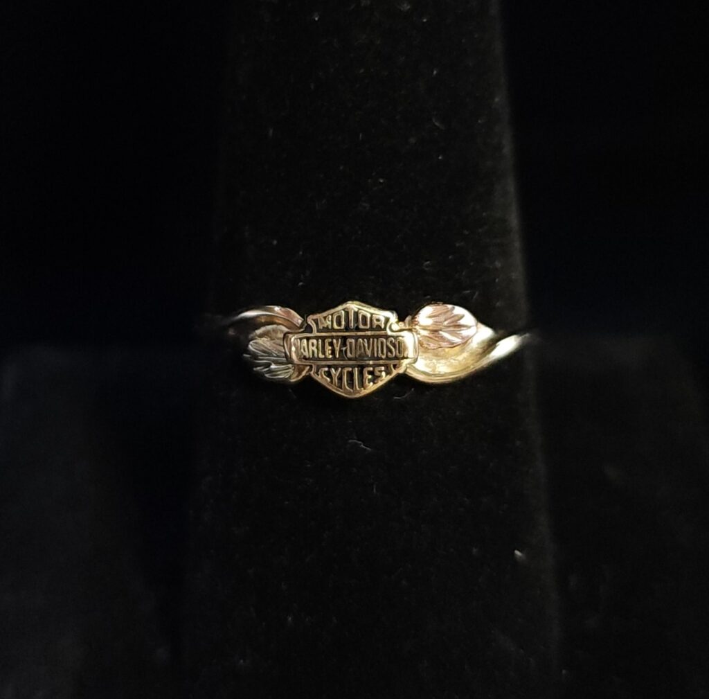 Set in 10kt gold, this Black Hills Gold ring has the Harley Davidson Motorcycles logo at the center. This ring is a must for the Harley rider/passenger, and especially those who are Sturgis fans! #morethanakiss #estatejewelry