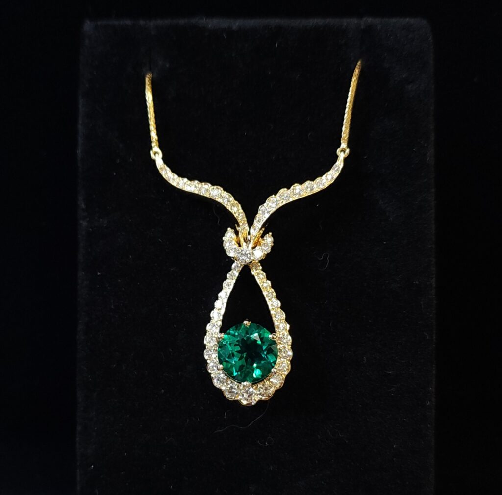 This absolutely stunning necklace is set in 14Kt yellow gold with 1 carat total weight of diamonds and a beyond gorgeous 3.3 carat round lab emerald! This is a necklace we redesigned, and the only color that I could envision in it was emerald green. It is exquisite! #morethanakiss #PAJewelersCustomization