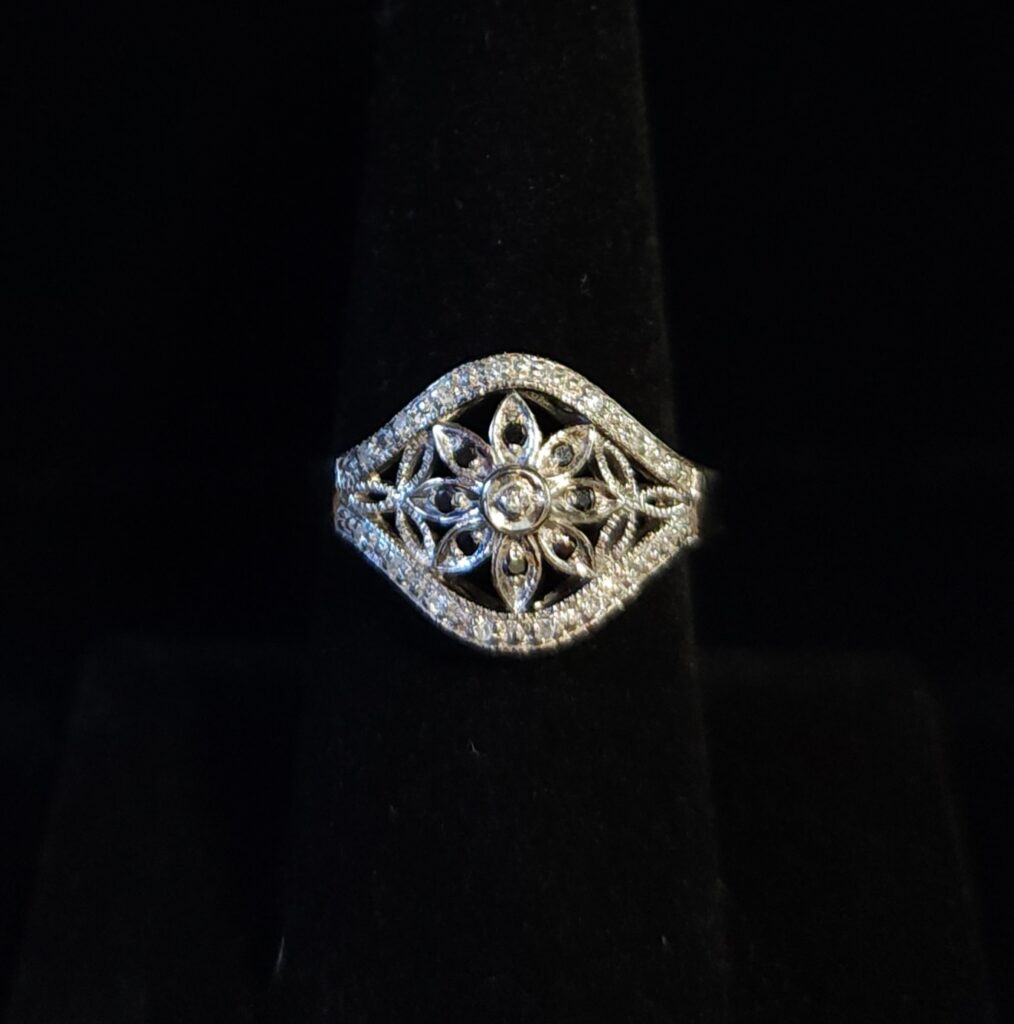 Set in 10Kt white gold, this unique ring has a flower design at its center. The ring is primarily accented by white diamonds, with the flowers petals accented by black diamonds. I love this ring because it is simple, yet beautiful and so fun! #morethanakiss #PAJewelersCustomization