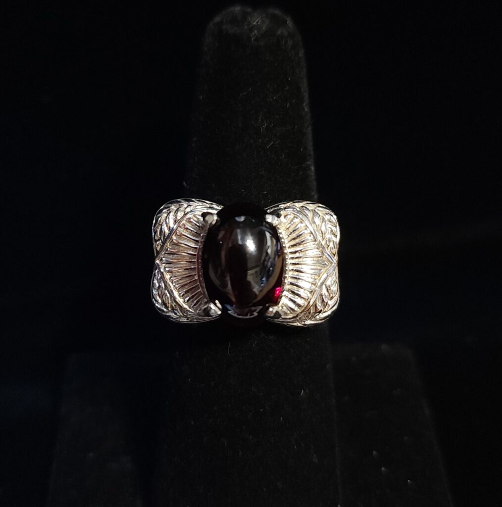 Set in 14Kt white gold, this ring has an over 6 carat garnet! This is one of my favorite garnet rings. First, it is a deep red cabochon garnet. Second, the intricate design of the ring gives it so much character. Third, it is definitely unique. Fourth, it is gorgeous! #morethanakiss #estatejewelry