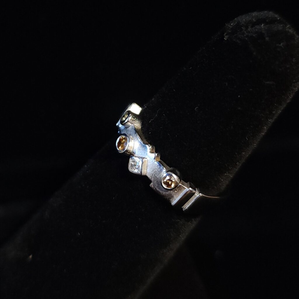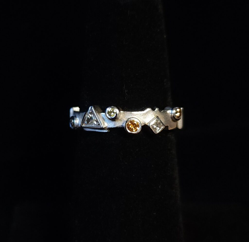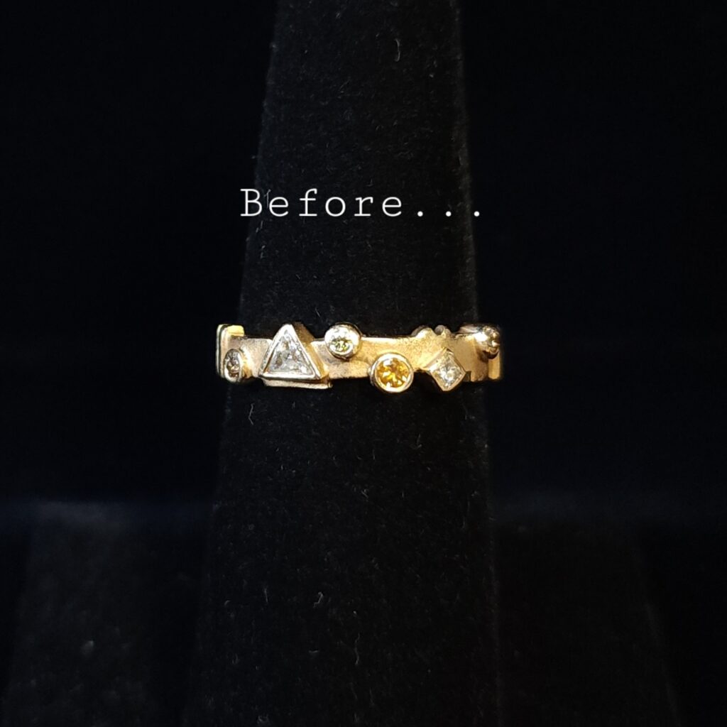 Sometimes you look at a ring and just feel it would be better showcased in white gold…or yellow gold. This 14kt yellow gold ring had different colored bezel set diamonds. I felt that the color of some diamonds got lost in the yellow gold. So we had our jeweler rhodium plate the ring to make it white….and I love it now ❤️ #morethanakiss #estatejewelry