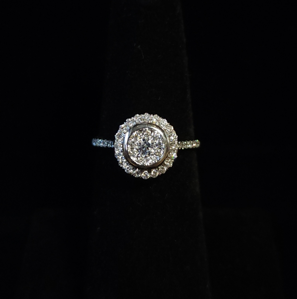 Set in 14Kt white gold with .57Ct total weight of diamonds, this beautiful diamond cluster ring has the look of a 2 carat diamond with a diamond halo. The center diamond cluster is very well done, and unless you are looking very closely, it looks like a single large diamond. All the big diamond look, without the big diamond price! #morethanakiss #estatejewelry
