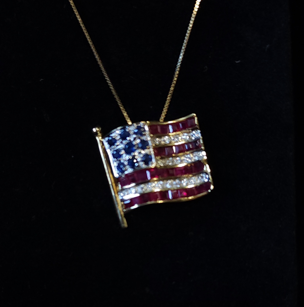 Set in 14Kt yellow gold, this gorgeous American Flag pendant has 1.6Ct total weight of rubies, .27Ct total weight of sapphires & .10Ct total weight of diamonds. I love the hidden bail on this pendant that makes the Flag look as if it is floating on the chain. ???????? #morethanakiss #estatejewelry #americanflagpendant