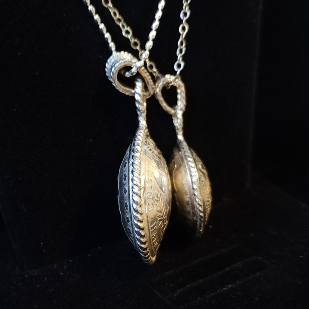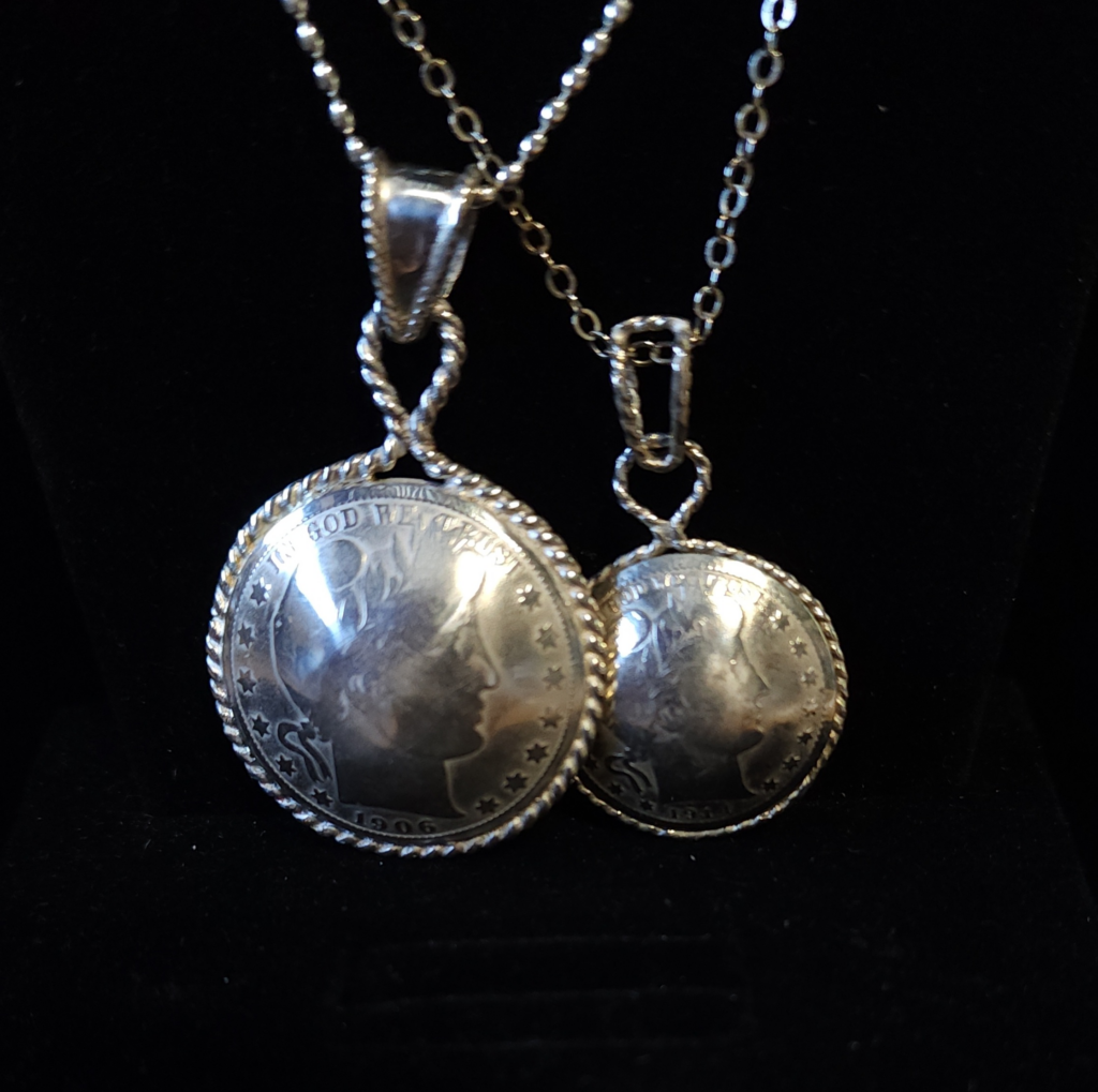 Historically, southwestern (Navajo) silversmiths would make beads from materials they had access to, including coins. Coin beads are formed by doming (by hand) two coins and then soldering them together. These types of coin beads were most frequently made with silver dimes (barber or mercury) and were/are called Navajo pearls. One of our local jewelry artists makes dime beads, and for “fun” wanted to see if they could use the same technique on silver quarters and half dollars. Given that quarters and half dollars are thicker than dimes, this was not an easy task. These pendants are the amazing results of their experiment. We have one barber quarter pendant & one barber half dollar pendant, each use .999 fine and .925 sterling silver to create the pendant. These are most certainly unique and may be one-of-a-kind, as the jeweler said once was enough ????! #morethanakiss #localjewelryartist #barbercoinbeads #barberquarter #barberhalfdollar