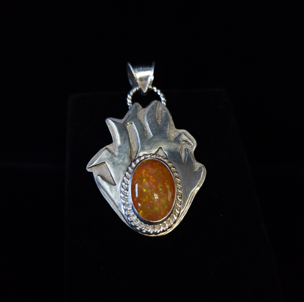 This massive opal has so much color and is 8.7 carats! It was set in a pendant by one of our local jewelry artists. The pendant is .999 fine & .925 sterling silver, with a fire design to represent the fire in this gorgeous opal! #morethanakiss #localjewelryartist #opal #opaljewelry #opalpendant