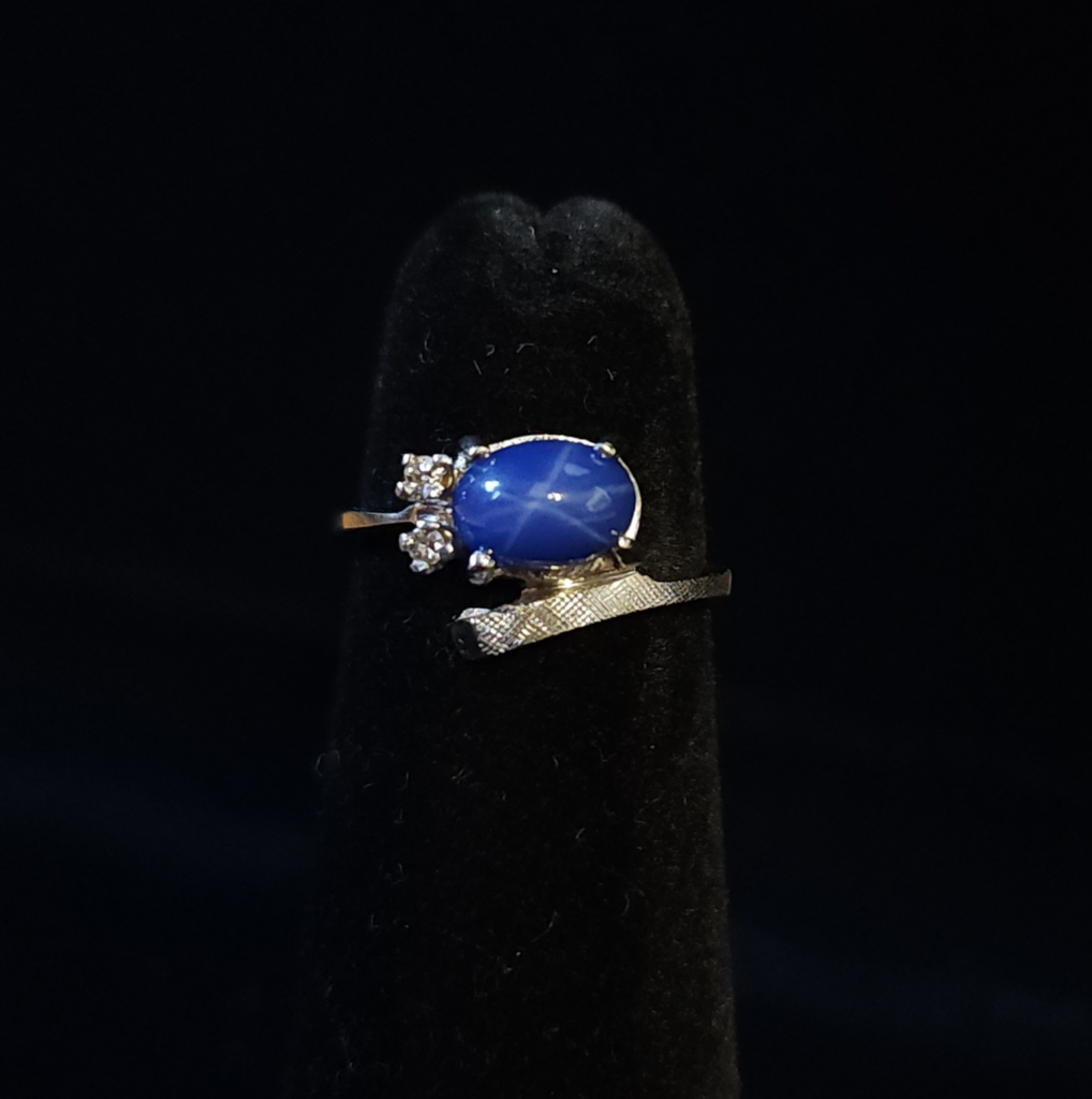 Set in 10Kt white gold, this vintage ring has an oval blue star sapphire with diamond accents. The unique thing about this ring is that the oval star sapphire is mounted east to west, rather than the traditional oval mounting of north to south. #morethanakiss #vintagejewelry #bluestarsapphire #vintagestarsapphire