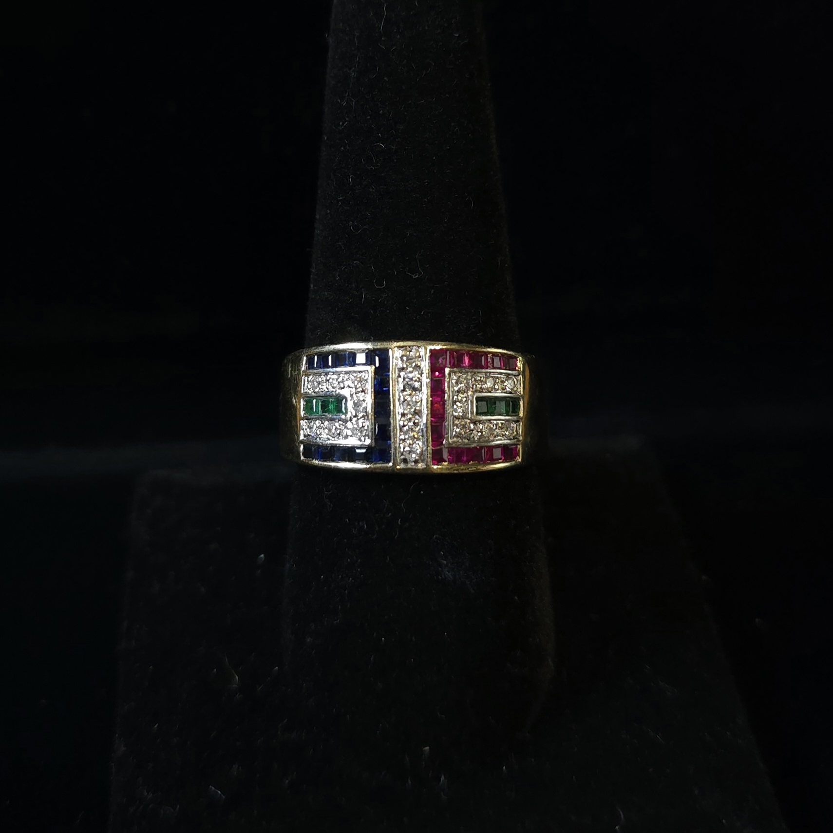 Why choose between rubies, sapphires, emeralds, or diamonds..when you can have all of the above! Set in 14Kt yellow gold, this beautiful band has .10Ct total weight of emeralds & diamonds and .20Ct total weight of rubies & sapphires! The design of this ring really does let each color shine! ???? #morethanakiss #atthefarmhouse #estatejewelry #rubysapphireemeralddiamond
