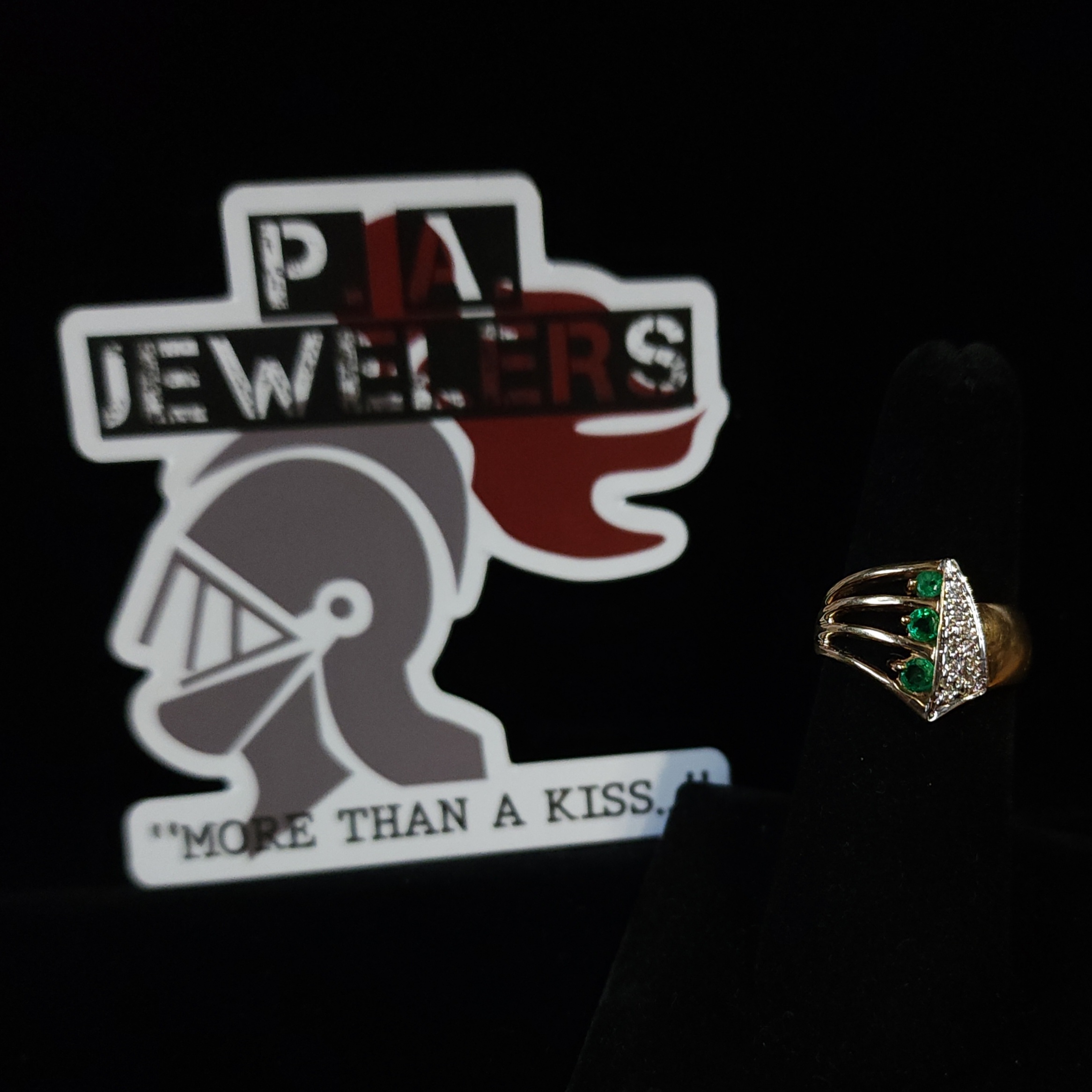 Set in 10Kt yellow gold, this ring features 3 natural emeralds in graduated sizes, totaling .25Ct. The gorgeous emeralds are also accented by .035Ct total weight of diamonds. This ring's design is as unique as it is beautiful! #morethanakiss #estatejewelry ...
