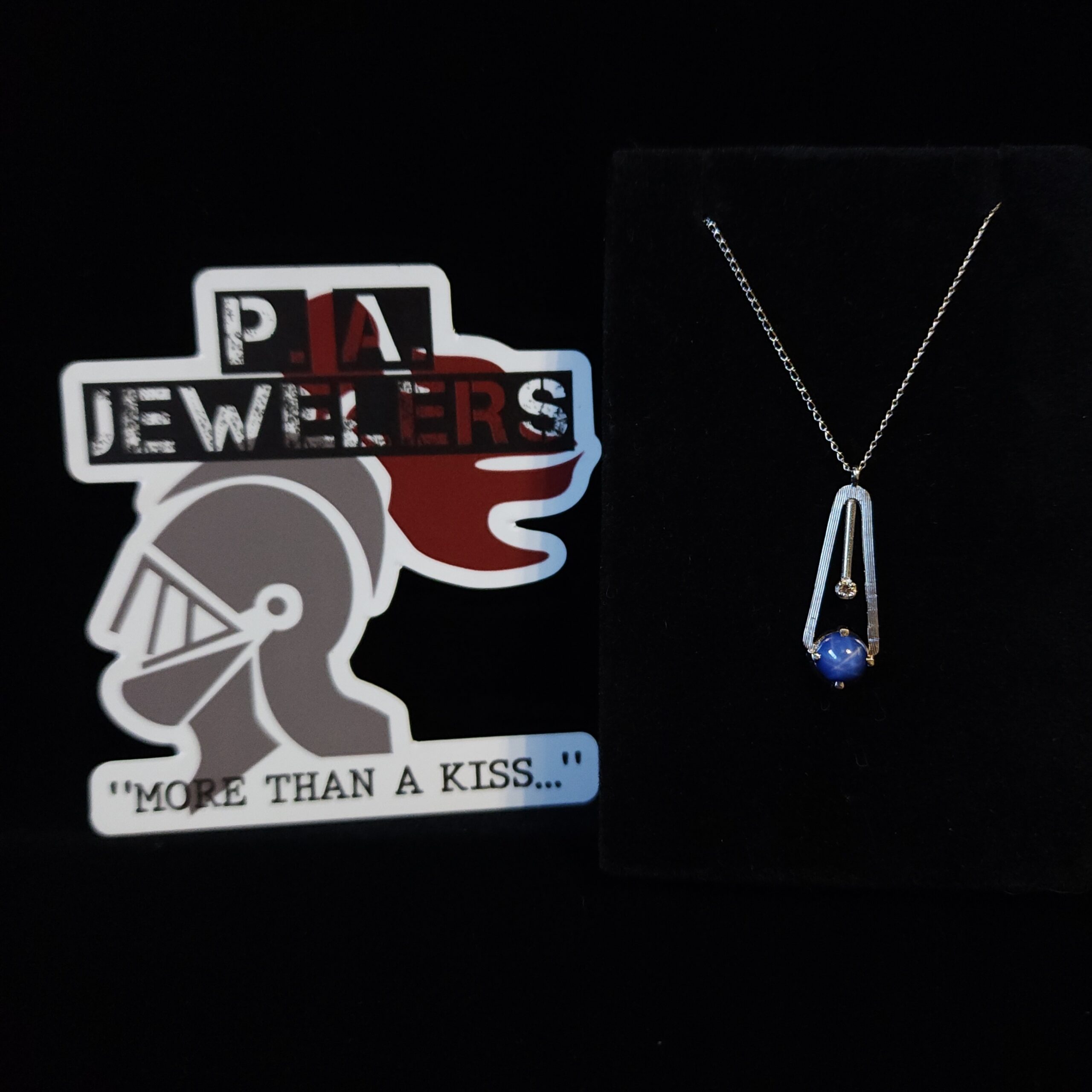 Set in 14Kt white gold, this unique necklace has a beautiful round blue star sapphire and a small white diamond. The pendant design gives this necklace maximum impact! #morethanakiss #estatejewelry ...