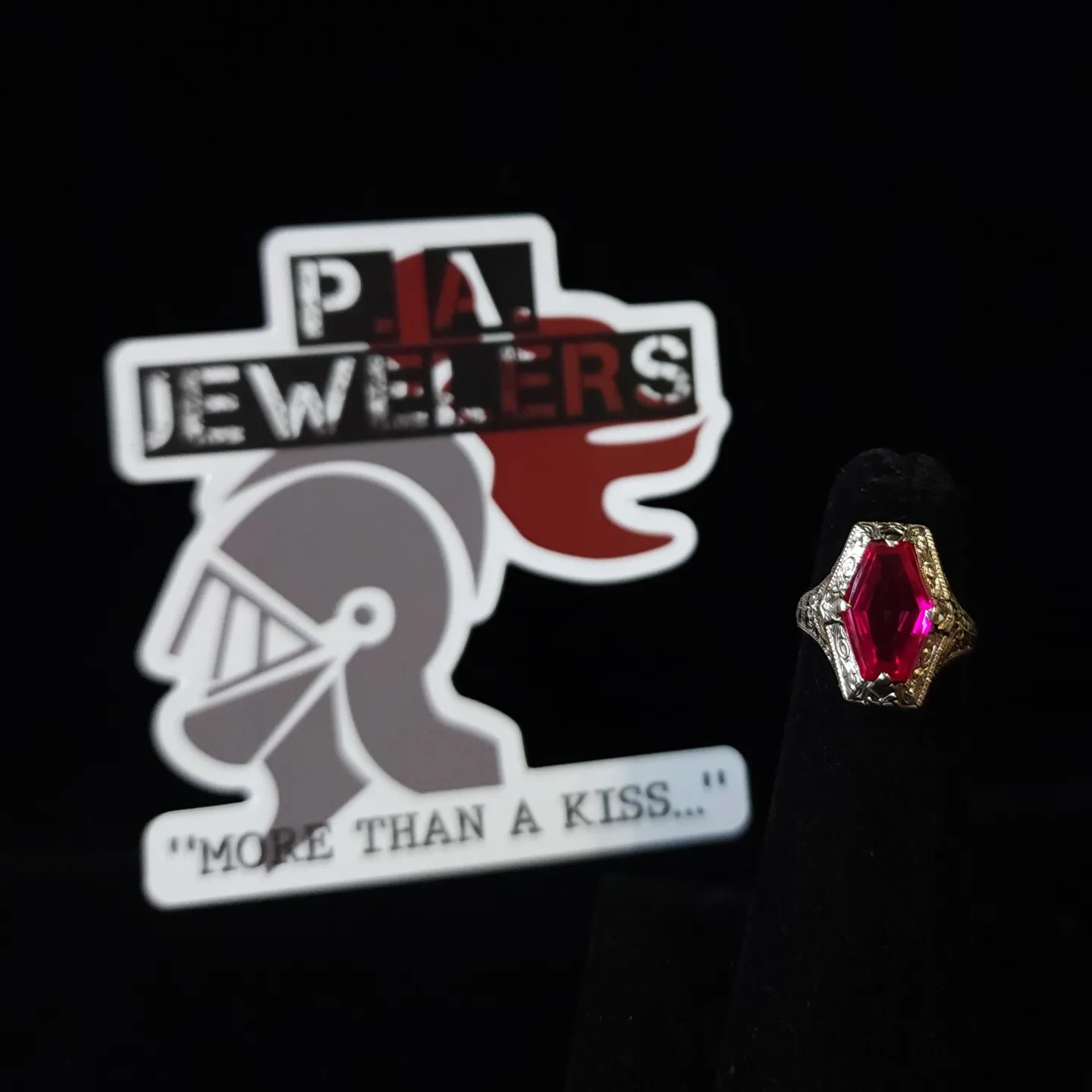 Set in 14Kt white gold, this beautiful antique filigree ring has a gorgeous coffin cut ruby as its star. This is a uniquely cut antique ruby in an equally uniquely detailed ring. If this ring could talk, I wonder what stories it would tell...