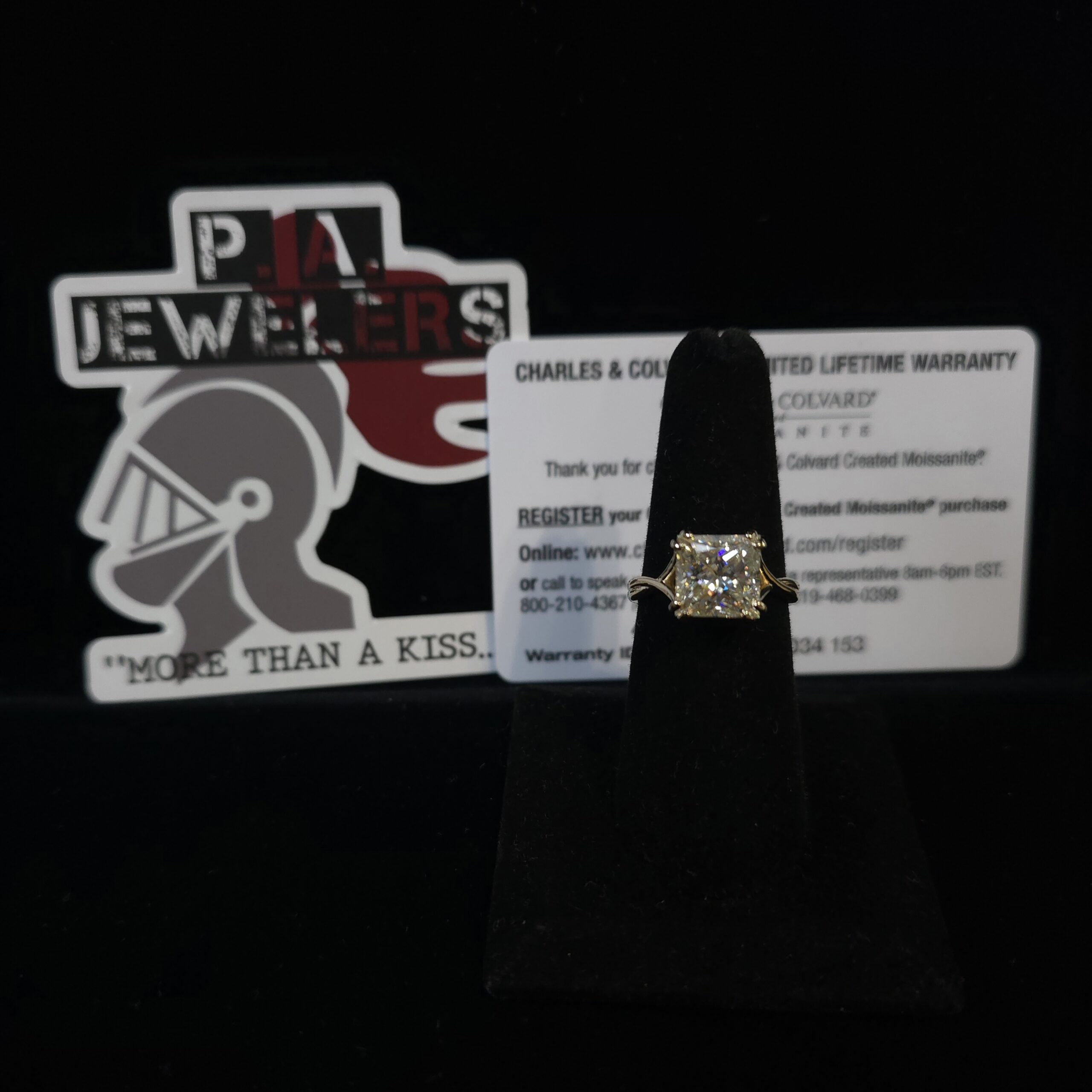 4 Carart Moissanite! Want a BIG impact look without the BIG impact price? This ring definitely fits that bill! Set in a 14Kt yellow gold solitare, with a twisted shank design, this ring has a massive 4 carat Charles & Covard princess cut moissolanite! This...
