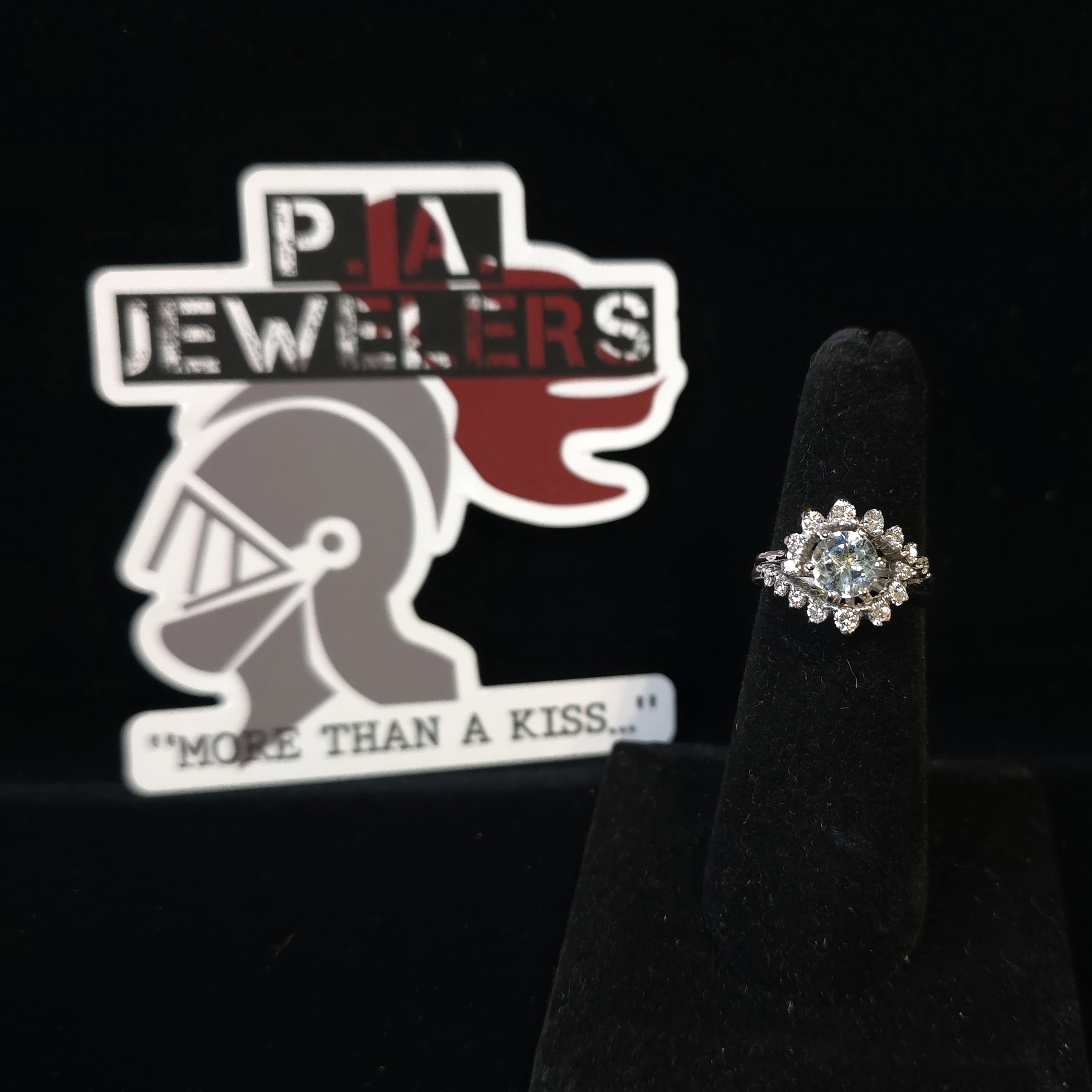 This gorgeous ring is set in 18Kt white gold and has a 1 carat aquamarine surrounded by waves of white diamonds (.25 carat total weight). This ring definitely gives an air of sophistication to the aquamarine, and the diamonds give it amazing sparkle! #morethanakiss #PAJewelersRedesign...