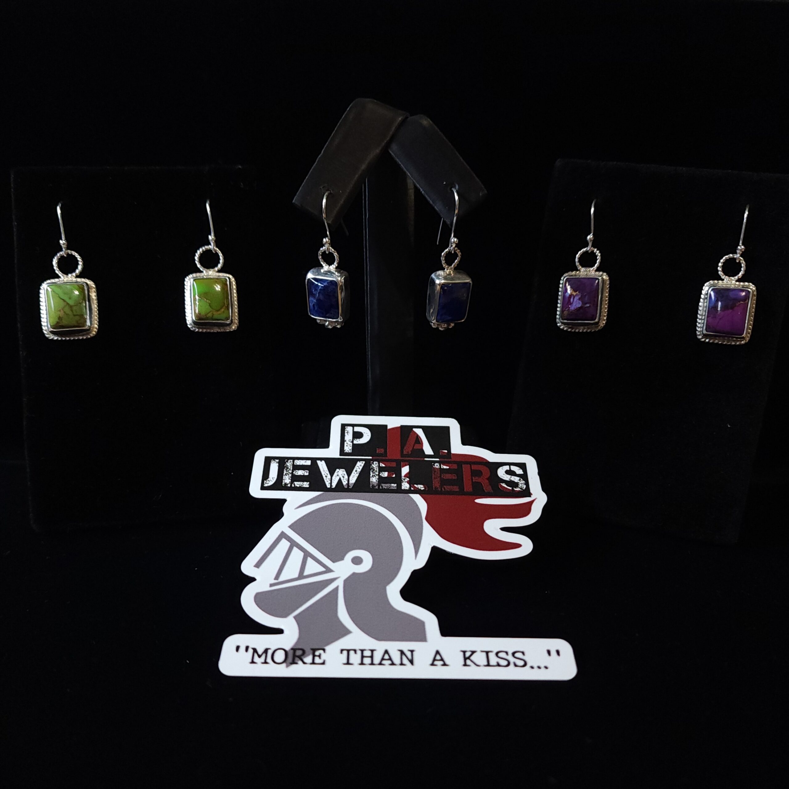 Set in .999 fine and .925 sterling silver, these perfectly sized dangle earrings feature green turquoise, purple turquoise, and a deep blue lapis. Get one to perfectly match your green, purple, or blue look...