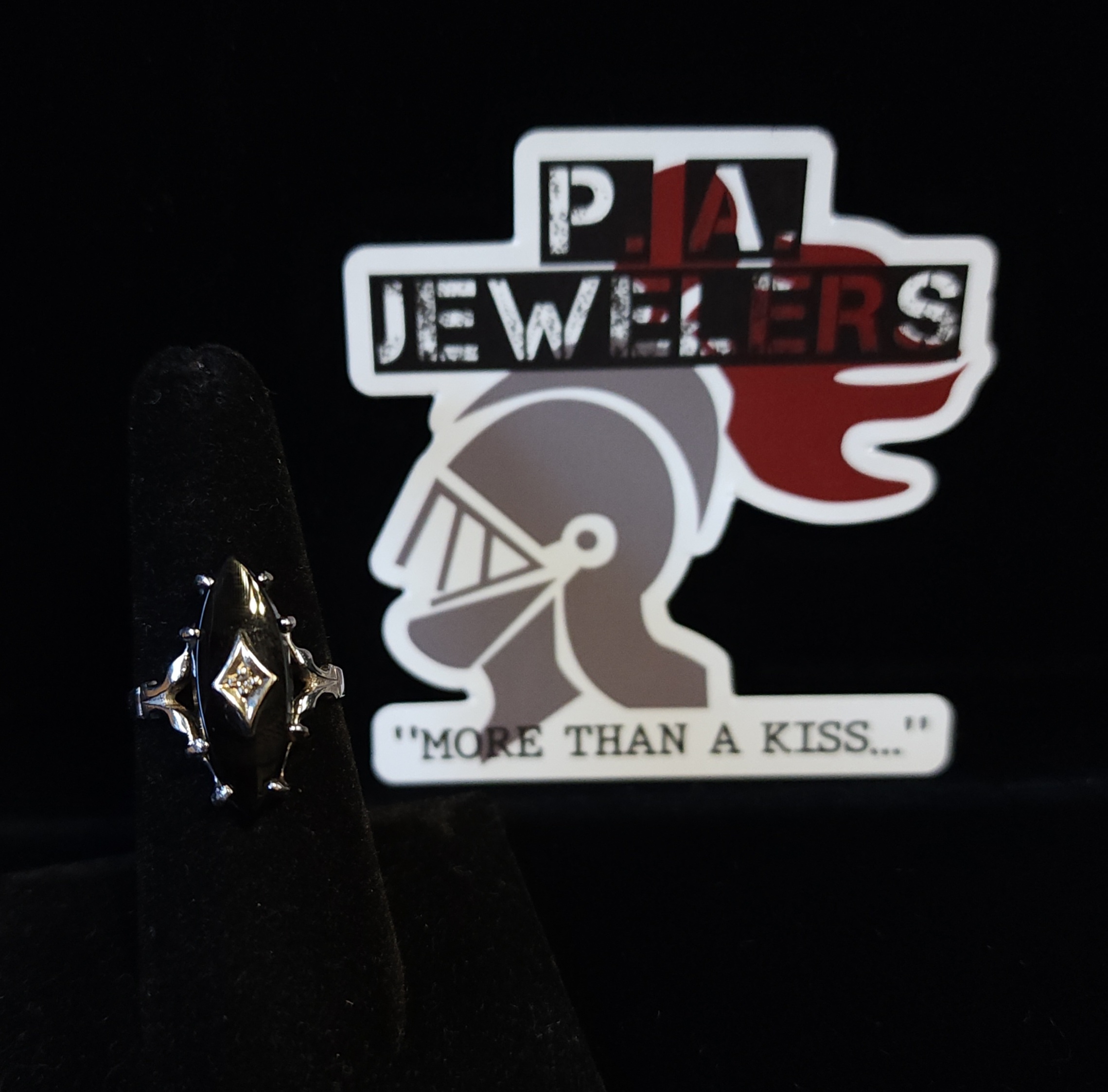 Of all of the antique onyx rings we have seen in the store, this one has been my favorite. The unique shape, the exaggerated prongs, the antique diamond…I love it all! Set in 10Kt white gold, this ring has a marquise shaped onyx with an...