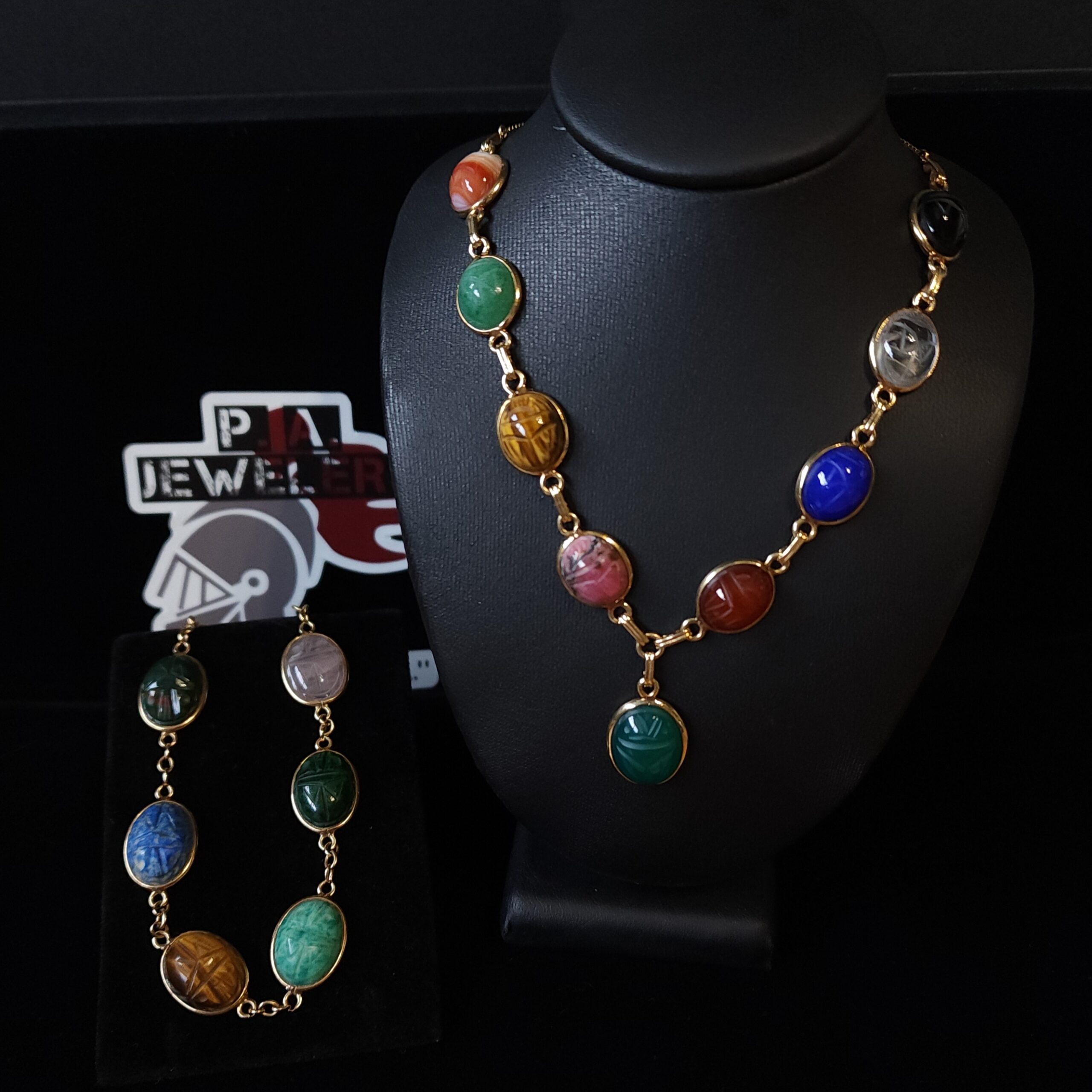 In ancient Egypt, the scarb was closely connected to the sun god Khepri, who brought the sunrise over the horizon each day. Thus, the scarb became a symbol or rebirth, regeneration, & protection in the afterlife. This lovely necklace & bracelet are each set in...